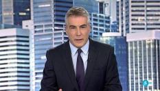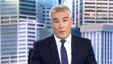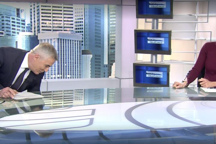 David Cantero saca algo de debajo de la mesa durante el Informativo de Telecinco.TELECINCO