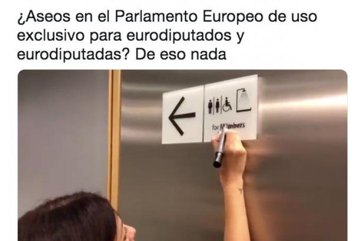 Sira Rego, eurodiputada de Izquierda Unida, ha publicado en su cuenta de Twitter un vídeo en el que se la puede ver modificando el cartel de uno de los aseos del Parlamento Europeo.