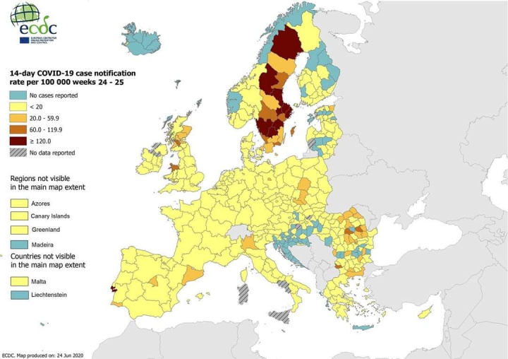 El 24 de junio, los dos únicos países de Europa con zonas donde se registraron más de 120 casos por 100.000 habitantes en los últimos 14 días eran Suecia y, muy por detrás, Portugal.