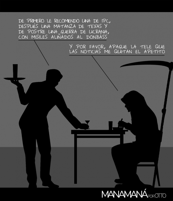 'De primero, le recomiendo una de IPC'Hechos y desechos de la última semana a golpe de viñeta. Carlos Alejándrez Otto 16/07/2022 a las 07:15 Comment COMENTAR> Facebook Twitter Whatsapp Email 62d1611d250000e13247645bCARLOS ALEJÁNDREZ 'OTTO' 62d16135250000d29647645dCARLOS ALEJÁNDREZ 'OTTO' 62d1843121000069745f01eeCARLOS ALEJÁNDREZ OTTO 62d1845522000064914f9533CARLOS ALEJÁNDREZ OTTO Carlos Alejándrez Otto viñetas Blogs Opinión life El HuffPost para Bodegas Avelino Vegas Avelino Vegas propone tres maridajes para estas navidades de la mano de los hermanos Torres Newsletter Recibe las notificaciones más importantes en tu correoapúntate a nuestro boletín Últimas noticias Una fuga de agua en el Louvre daña cientos de obras y documentos antiguos Este es el río más peligroso del mundo: sus aguas 'devoran' los barcos sin dejar rastro Al menos tres personas fallecidas y varias heridas por un golpe de mar en el sur de Tenerife El Mundial VIRTUS Futsal de Torrevieja, el "cambio de mirada" definitivo para los deportistas con discapacidad intelectual en España Adopta un perro y el cartel que cuelga en la comunidad de vecinos da la vuelta a España: la respuesta de uno de ellos triunfa Se topan con jaulas de animales en medio del bosque y el plan que tuvo al respecto este restaurador pone los pelos de punta Enrique Tomás desmonta el mito más extendido sobre cómo acompañar el jamón y su aviso sobre el vino tinto es tajante: "Es el peor maridaje" Yousri, joven de 28 años que ha recorrido Túnez y Argelia para regalarle una oveja a su abuela: "Quise demostrar mi amor" Prisión provisional para el jefe de Estupefacientes de la Policía Nacional detenido en Valladolid ¿El panettone gana terreno al roscón? Por qué triunfa este dulce italiano y cómo elegir uno de calidad