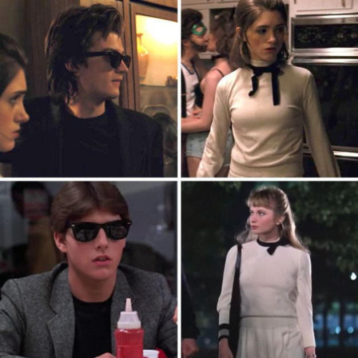 Las gafas Ray-Ban delatan a Steve, ya que el look de Nancy es mucho menos reconocible. ¡Efectivamente! Steve es Tom Cruise en Risky Business y Nancy es Rebecca De Mornay. El mismo jersey con un lazo negro atado en el cuello, el mismo peinado y la misma falda plisada.