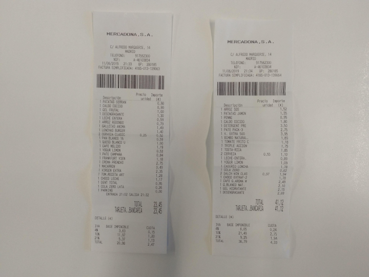 Una vez finalizada la compra, el total del recibo también difiere mucho entre un caso y el otro. El carrito lleno de productos de marca blanca ha costado 23,45 euros, mientras que el otro ha ascendido a 41,12 euros.