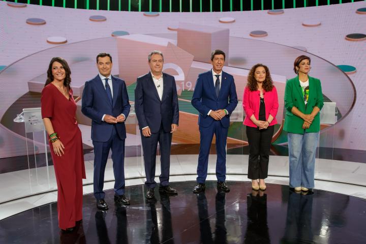 A las 21.30 horas arrancaba este debate con los mismos boxeadores: Juanma Moreno (PP), Juan Espadas (PSOE), Macarena Olona (Vox), Juan Marín (Ciudadanos), Teresa Rodríguez (Adelante Andalucía) e Inmaculada Nieto (Por Andalucía). Y el ánimo era desde el principio como la ola de calor que azota España y especialmente el sur.