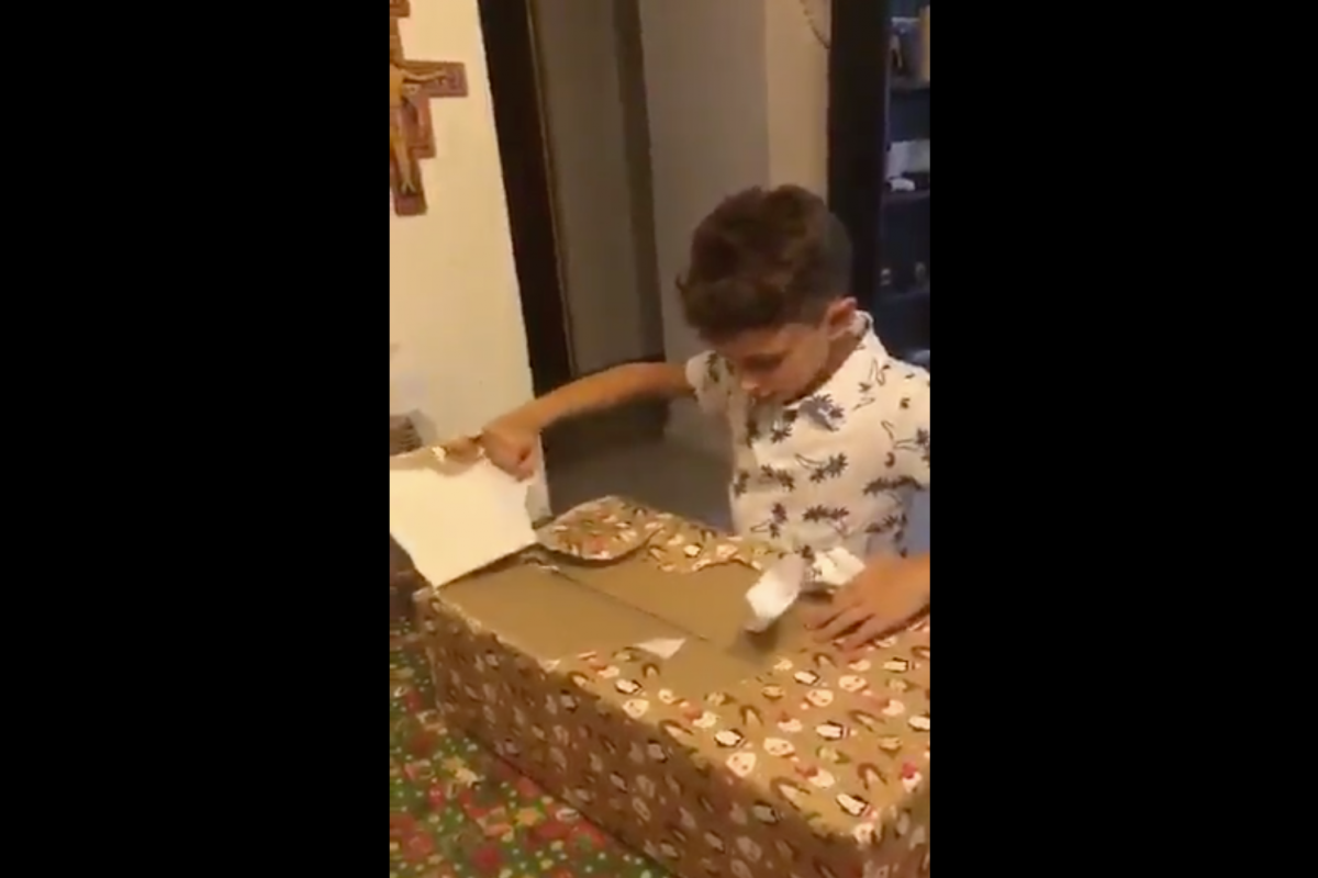 El niño comienza a desenvolver el regalo y se queda ojiplático cuando ve que lo que hay es una caja de cartón.
