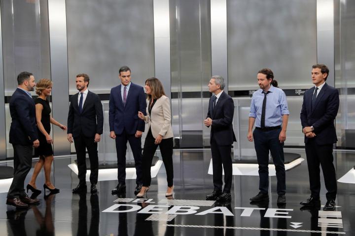 170 minutos. Pedro Sánchez, Pablo Casado, Albert Rivera, Pablo Iglesias y Santiago Abascal encerrados en el mismo plató en el Pabellón de Cristal de la Casa de Campo. ¿Y? Un debate bronco, de reproches constantes, de miradas desafiantes, de posturas ancladas. El retrato de la España del bloqueo.