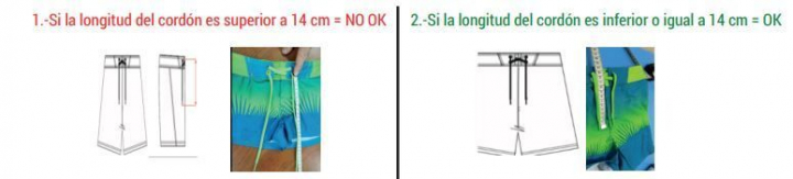 “Por ello, te rogamos que dejes de usar el producto si la longitud del cordón en la zona de la cintura es superior a 14 centímetros”, pide la compañía, que explica cómo hay que medir esa tira: “Con el producto en horizontal, mídelo desde el ojal de salida del cordón, como en la foto siguiente”.