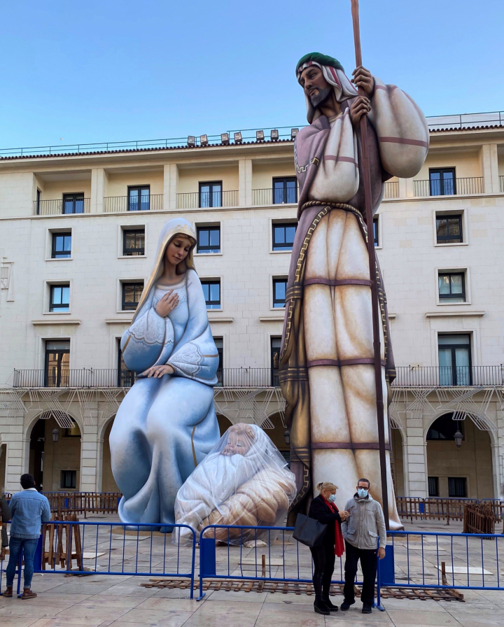 Cuando decimos gigante, es gigante. El San José del belén de Alicante es casi más grande que el edificio que tiene detrás, mide 17 metros, y la virgen María y el niño Jesús no se quedan cortos. La figuras, que han entrado en el libro Guinness de los récords, han costado más de 130.000 euros y son, cuando menos, turbias.