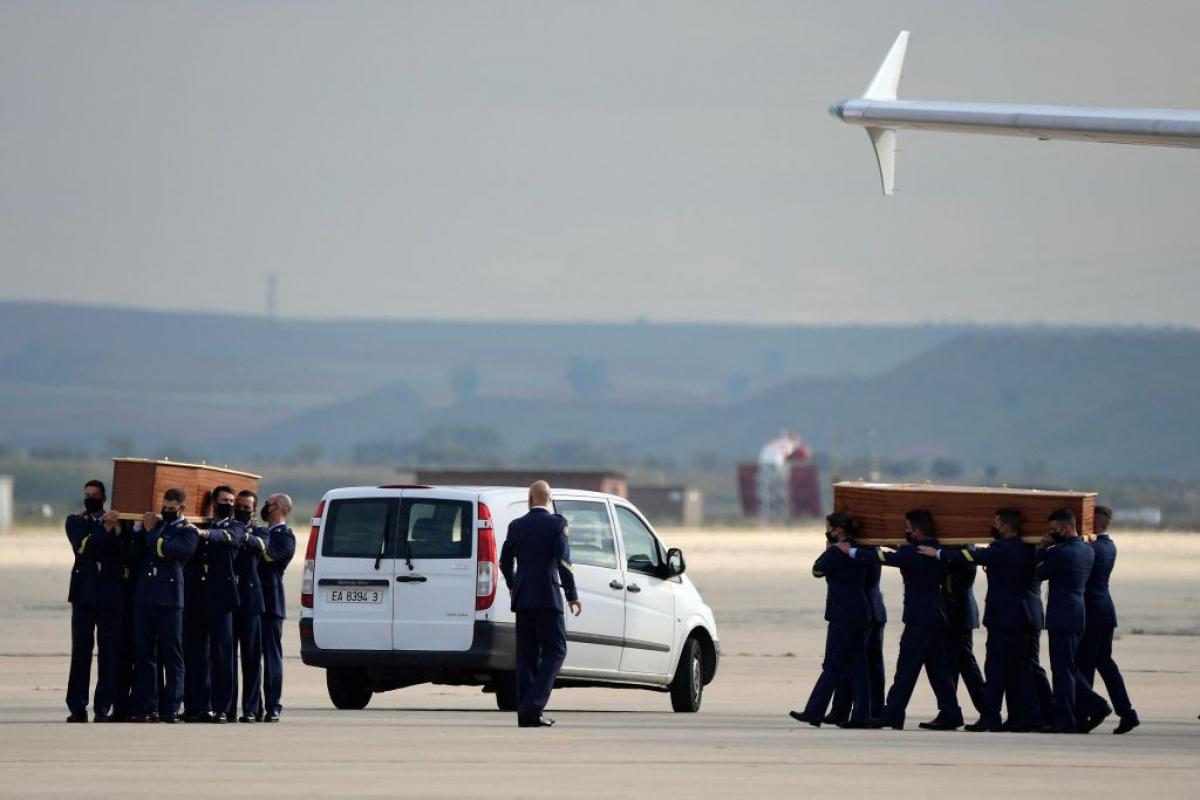 En una ceremonia presidida por las ministras de Defensa y de Exteriores, los cuerpos de los tres fallecidos han sido recibidos por un cordón militar de honor y transportados a hombros por veinticuatro soldados del Ejército del Aire.