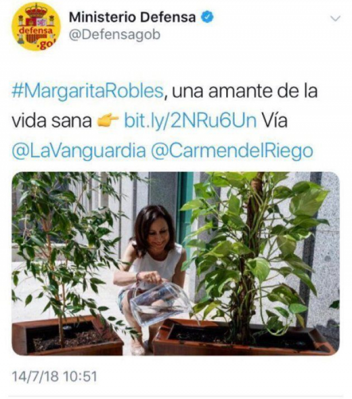 "Margarita Robles, una amante de la vida sana". Con este breve texto y una imagen de la ministra de Defensa regando unas plantas, el Ministerio de Defensa promocionaba una entrevista a la máxima responsable de esta institución en La Vanguardia.