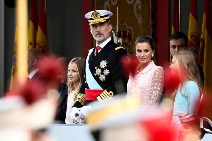 MADRID, SPAIN - OCTOBER 12: King Felipe of Spain, Queen Letizia of Spain, Princess Leonor and Princess Sofia attend the National Day Military Parade on October 12, 2019 in Madrid, Spain. (Photo by Carlos R. Alvarez/WireImage)Carlos R. Alvarez via Getty Images