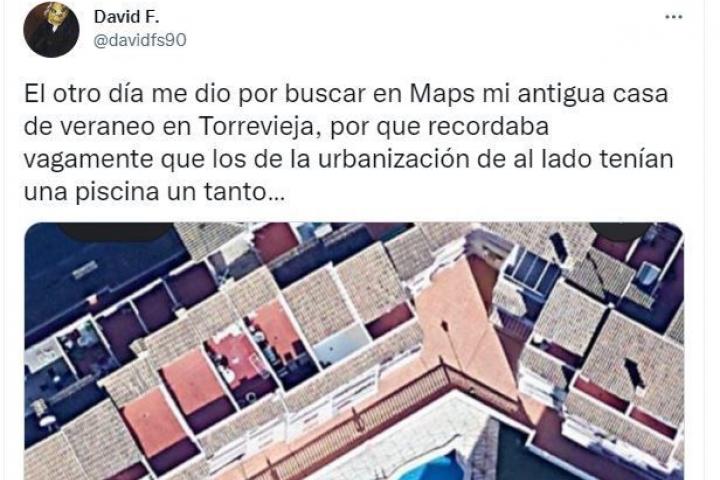“El otro día me dio por buscar en Maps mi antigua casa de veraneo en Torrevieja, porque recordaba vagamente que los de la urbanización de al lado tenían una piscina un tanto...”, ha escrito el usuario.