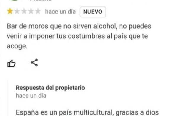 Un cliente ha dejado una de esas reseñas que está generando indignación en redes sociales por lo insultante que le ha parecido a muchos. “Bar de moros que no sirven alcohol, no puedes venir a imponer tus costumbres al país que te acoge”.