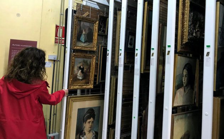 Cuando entré en los almacenes, me encantó ver ese largo pasillo con armarios compactos que conservan piezas patrimoniales de cerámica o del mundo egipcio, frente a plataformas correderas de las que cuelgan cientos de cuadros y obras de artistas importantes en la historia del arte. Cada paso que daba suponía descubrir algo nuevo. También había un gran espacio donde, cubiertas con plásticos, se guardaban más de una decena de grandes esculturas.