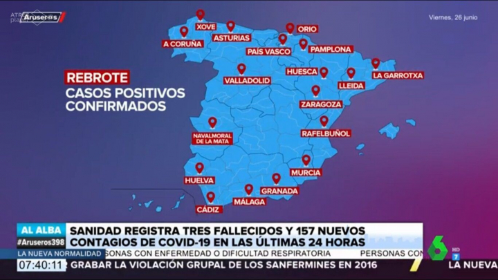 Todavía queda uno más. En laSexta, esta vez en el programa matinal de Aruseros, que presenta Alfonso Arús, quisieron repasar el pasado 26 de junio el mapa de los rebrotes en toda España. En Aragón, de nuevo, se volvieron a equivocar: a Zaragoza la sitúan en Teruel y a Huesca en Zaragoza.