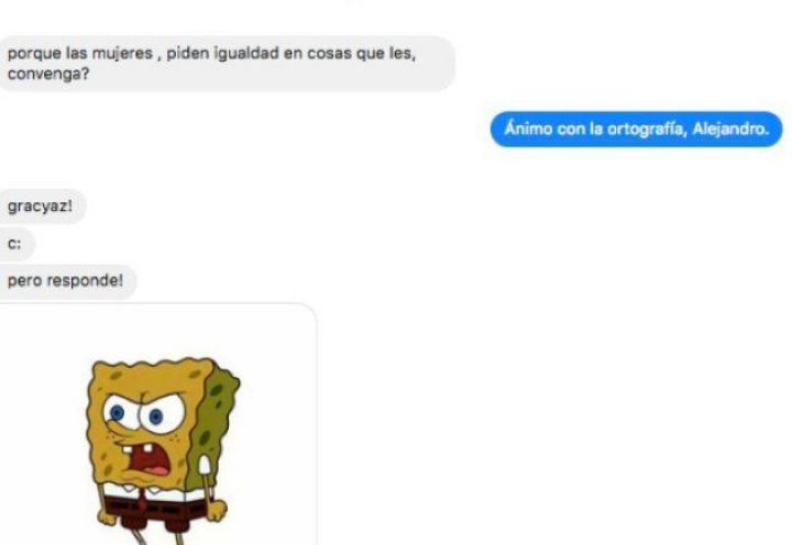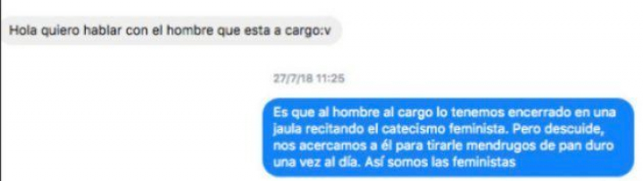 La verdad es que al principio tenían gracia. Cada día llegan varios mensajes con una ortografía que deja mucho que desear en la que nos preguntan o incluso "exigen" hablar con el hombre al cargo de la página. Como son los más habituales, en su día decidimos crear una respuesta automática y quedarnos tan anchos: "Es que al hombre al cargo lo tenemos encerrado en una jaula recitando el catecismo feminista. Pero descuide, nos acercamos a él para tirarle mendrugos de pan duro una vez al día Así somos las feministas".