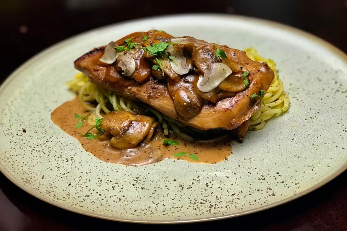 Delicias de pollo con vino Marsala, tallarines y champiñones al ajillo