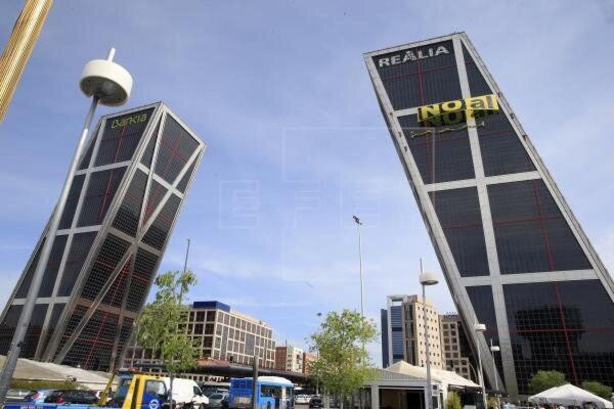 Una góndola de limpieza se ha caído sobre las 10 de esta mañana desde la azotea de la Torre Bankia, una de las Torres Kío, en Madrid.