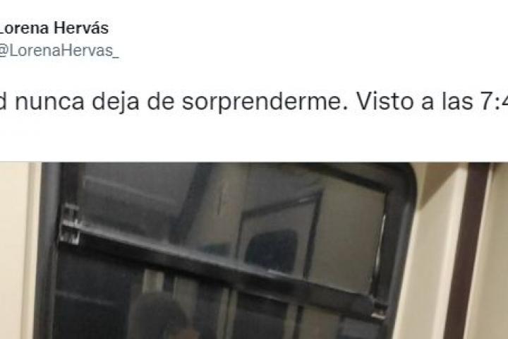La periodista Lorena Hervás ha compartido en su perfil de Twitter lo que se ha encontrado mientras viajaba en el subterráneo madrileño. “Madrid nunca deja de sorprenderme. Visto a las 7:40”, ha escrito junto a la imagen.