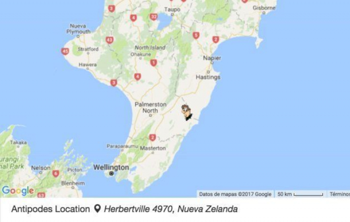 Utilizando el mapa, hemos descubierto que nuestro punto antípoda es una preciosa localidad costera de Nueva Zelanda: Herbertville.