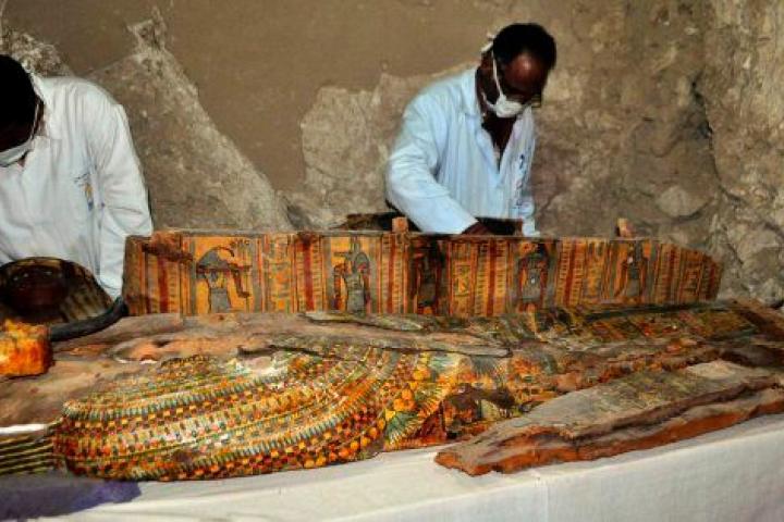 Al final de la cámara interna se encontró un escondite con sarcófagos ornamentados con colores en buen estado, que contiene momias envueltas en lino de la dinastía XXI (1.969-943 a.C.).