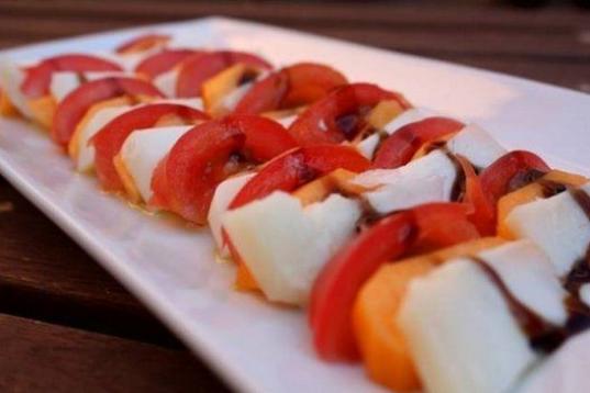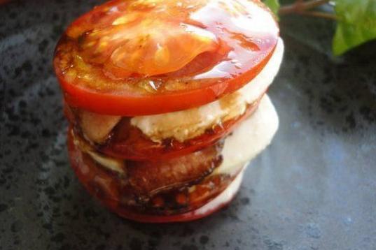 Se prepara por capas: tomate, mozzarella fresca, bacon y cebolla, y así tres veces. Va acompañado de una vinagreta con vinagre balsámico, aceite de oliva y sal.