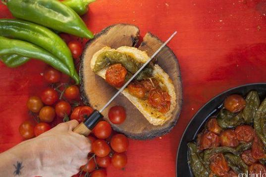 Los pimientos son verdes italianos y se sirven sobre una rebanada de pan de hogaza.