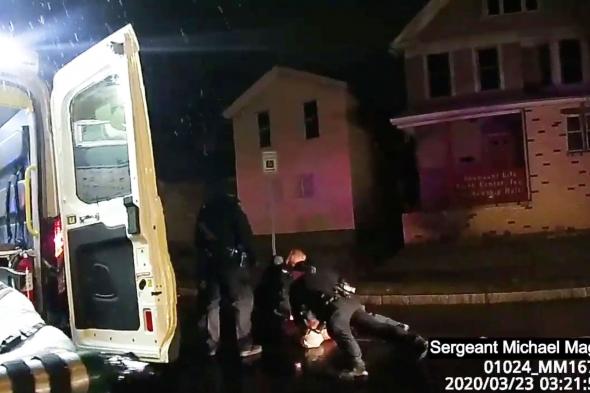 En los videos publicados en varios medios se ve a Prude, quien se ha desnudado, con las manos detrás de la espalda, esposado y gritando antes de que la policía le tapara la cabeza con una capucha, aparentemente para evitar que les escupiera, ya que había gritado que tenía coronavirus.