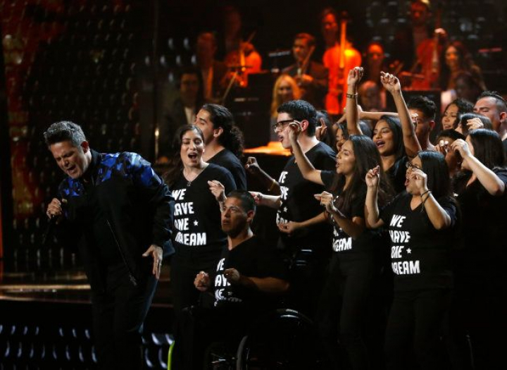 En medio de la interpretación de un popurrí de sus temas más conocidos, el autor de Corazón partío dijo que lleva "media vida tratando de tirar los muros", en clara alusión a otra promesa de campaña de Trump. "Por cada piedra, un soñador", repitió una y otra vez Sanz. "¡Dreamers!", gritó, y fue secundado por un coro formado por jóvenes dreamers, con los que se fusionó en un emotivo abrazo al finalizar su actuación.