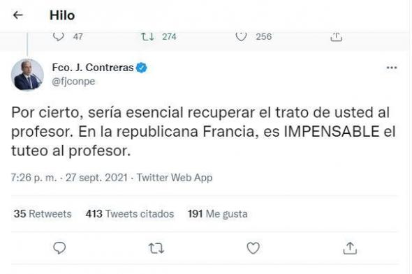 Es más, el político va un poco más allá y se muestra contrario a que los alumnos tuteen al profesor: “Por cierto, sería esencial recuperar el trato de usted al profesor. En la republicana Francia, es IMPENSABLE el tuteo al profesor”.