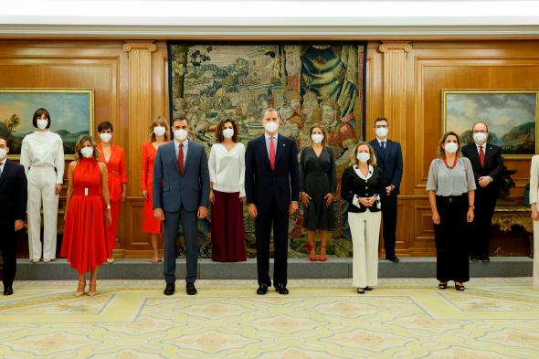 MADRID, 12/07/2021.- El rey Felipe VI (d) y el presidente del Ejecutivo, Pedro Sánchez (2d), observan a la nueva ministra de Ciencia e innovación, Diana Morant, durante el acto de toma de posesión de los nuevos nombramientos que tiene lugar ...