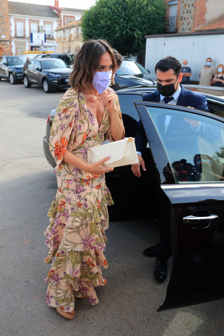 Para la especial y calurosa jornada, Tamara Falcó eligió un veraniego vestido largo firmado por Johanna Ortiz, una de sus modistas de cabecera. Completaba el look de invitada con una cartera blanca, joyas de Tous y unas sandalias de cuña de la firma Aquazzura.
