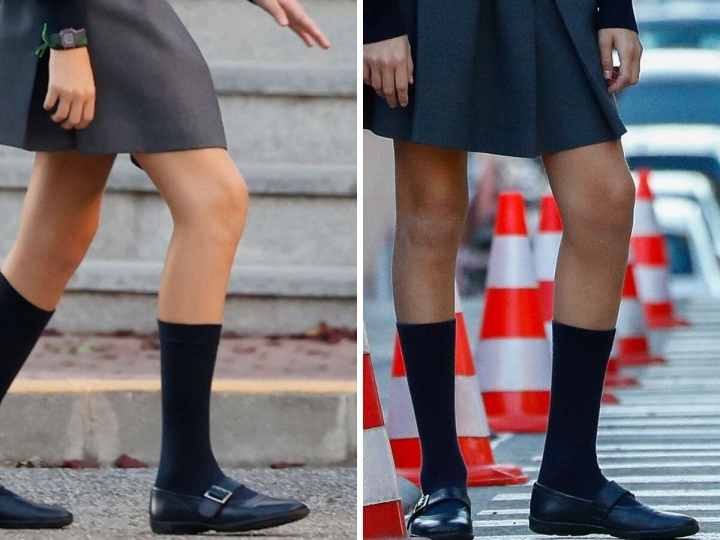 7. Mismos zapatos. Las normas sobre el uniforme del Colegio Santa María de los Rosales exigen zapatos oscuros, pero no dictan el estilo. De hecho, los zapatos de Leonor y Sofía del curso anterior no se parecían entre ellos. Este 2020/2021 Leonor sigue siendo fiel al estilo con hebilla elegido el año pasado.
