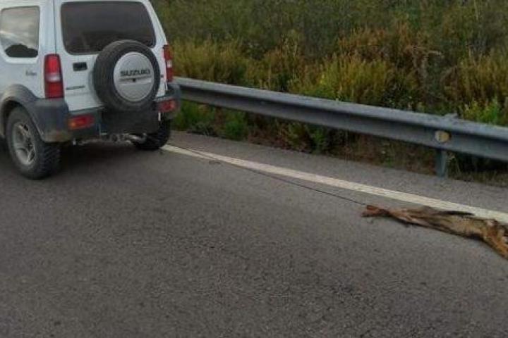 Estaba atado con una cuerda por las patas traseras a la bola de remolque del vehículo, presentado un lamentable estado físico debido al arrastre durante varios kilómetros.