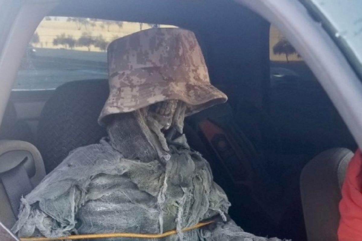 El conductor colocó un sombrero en la cabeza del esqueleto para hacerle pasar por una persona, pero no coló. Según medios locales, el hombre fue detenido y multado después de que un policía se diese cuenta de que el misterioso ocupante iba vestido con harapos y estaba atado al asiento con una cuerda.