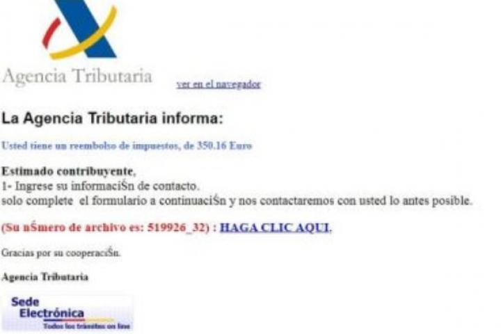 En el vemos el logotipo de la Agencia Tributaria y un mensaje en el que supuestamente el organismo fiscal nos informa de que nos van a devolver 350,16 euros y que el número de archivo es el 519926_32.