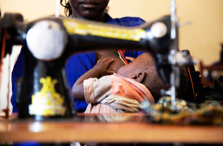 Una de las niñeras del centro de formación entra en la sala de costura con un bebé en brazos. En cuanto el pequeño, de 10 meses, ve a Anna, le echa los brazos. Tiene hambre, así que se acerca al pecho. Anna le acaricia mientras le da de mamar. Su bebé no sabe lo que es ser un “bebé del bosque”. Los matrimonios y embarazos precoces son muy comunes en Sudán del Sur, también entre las niñas utilizadas en grupos armados.