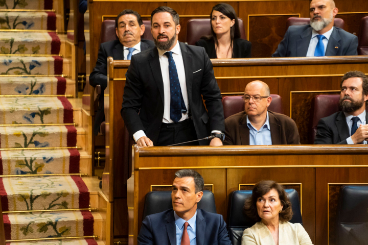 Solo un diputado diputado socialista, José Zaragoza, se ha colado en esa fila al sentarse entre Santiago Abascal y Iván Espinosa de los Monteros. El resto de los parlamentarios del PSOE han tenido que sentarse en la parte de arriba.