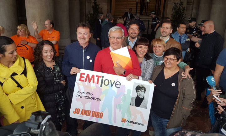 La ha protagonizado Joan Ribó, alcalde de Valencia y candidato de Compromís a la reelección. Los miembros de la coalición ecosoberanista han anunciado medidas de movilidad como la ampliación del abono infantil de la EMT hasta los 14 años y del abono joven hasta los 30 años. El anuncio lo han realizado con un carnet gigante del abono EMT Jove en el que se puede ver una fotografía del propio Ribó cuando era estudiante universitario.