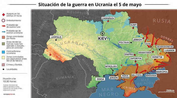 Algunas ciudades como Zaporiya ya han empezado a mover ficha y han decretado toque de queda entre el 8 y el 10 de mayo. Según se cree, existe la posibilidad de que los rusos intensifiquen sus ataque en víspera de la festividad para poder mostrar una victoria simbólica ese día.