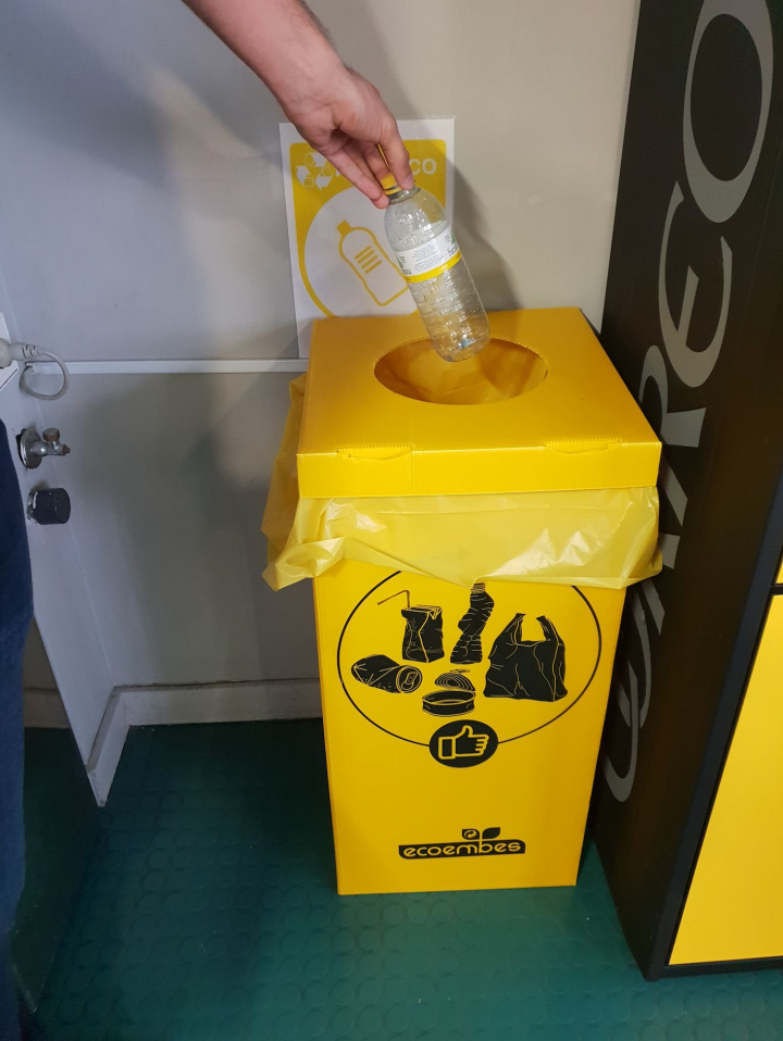 Cada día decenas de trabajadores pasan por aquí y consumen cafés, refrescos o snacks, con sus correspondientes vasitos y cucharitas de plástico, latas, botellas, y bolsas. Gracias a este cubo amarillo, todos esos residuos se convertirán en nueva materia prima y no en deshechos contaminantes.
