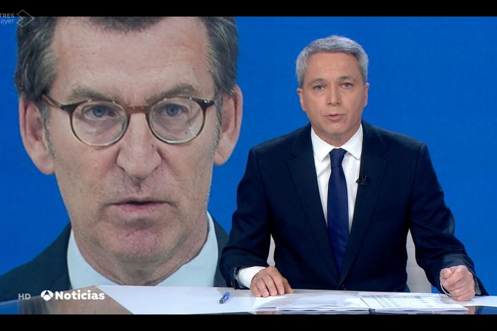 Antes de dar paso al vídeo del nuevo presidente del PP, Vallés ha dicho: “En cuanto ha terminado esa intervención del presidente en el Congreso el PP ha decidido movilizarse hasta el punto de que Feijóo ha tomado la decisión de lanzar lo que podríamos considerar su primera ofensiva seria sobre Pedro Sánchez desde que es el líder del PP. Hoy sí Feijóo ha empezado a utilizar palabras gruesas”.