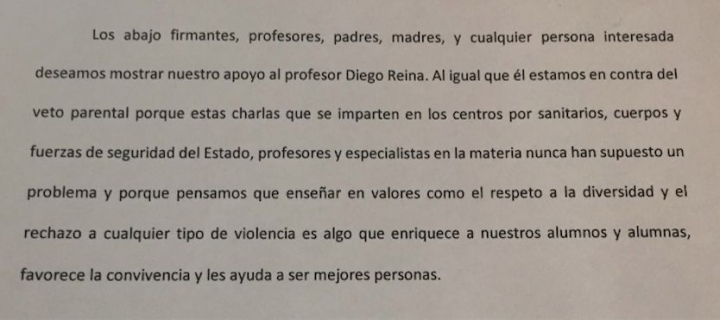 “Tengo correos y cartas que las familias han mandando al instituto sumándose a la iniciativa. También piden que no se les solicite permiso porque confían en el profesorado del instituto y en las actividades complementarias. Una abuela también nos ha enviado un mail con unas líneas muy bonitas defendiendo nuestra labor”, explica este docente que ya lleva tres años en el centro y que espera que los tribunales retiren el veto parental.