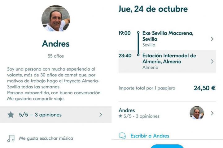 En la plataforma, el parlamentario se presentaba como “una persona con mucha experiencia al volante, más de 30 años de carné, que por motivos de trabajo hago el trayecto Almería-Sevilla todas las semanas. Persona extrovertida, con gran conversación. Me gustaría compartir el viaje”. Los usuarios le daban siempre la máxima nota, porque les hacía el viaje muy agradable, explican.