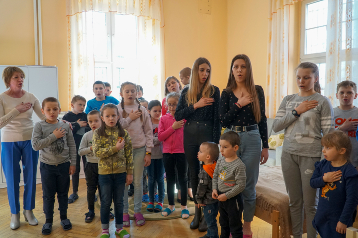 Recostados en camas, agitando unos juguetes o con la mirada perdida. Son los huérfanos ucranianos de Kovel, ahora refugiados en un antiguo edificio de la ciudad polaca de Lodz, y creen que su huida de la guerra es solo "parte de un juego". En la imagen, niños ucranianos del orfanato de Kovel cantan el himno ucraniano en un gesto de agradecimiento a la alcaldesa de la ciudad que ha visitado el lugar.