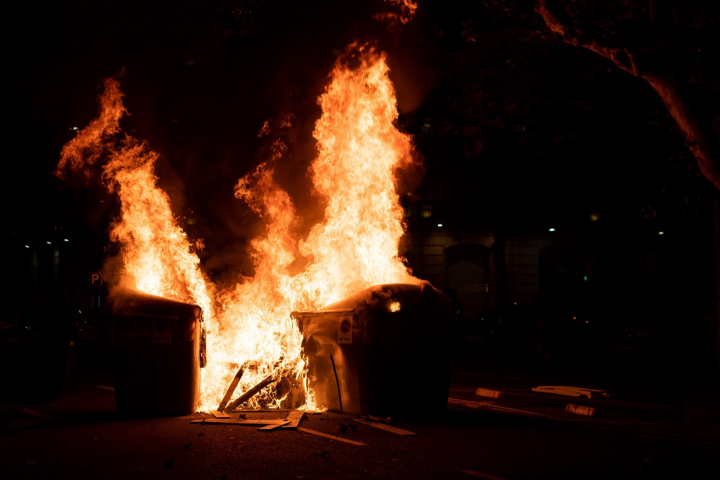 Los bomberos tratan de apagar los contenedores en llamas en las calles de Barcelona. Se ven vehículos en servicios de urgencia en varios puntos de la ciudad.