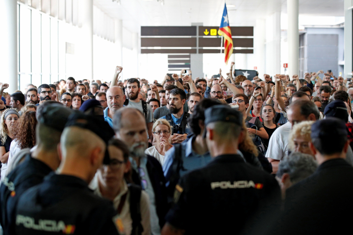 El aeropuerto de El Prat ha sido el foco central de los enfrentamientos entre manifestantes y agentes de los Mossos -con refuerzo de la Policía Nacional-. Durante toda la jornada allí se han registrado más de un centenar de vuelos cancelados y la práctica totalidad de los heridos atendidos -75 de los 78 confirmados a última hora de la noche- tras horas de alta tensión.