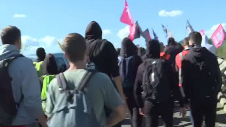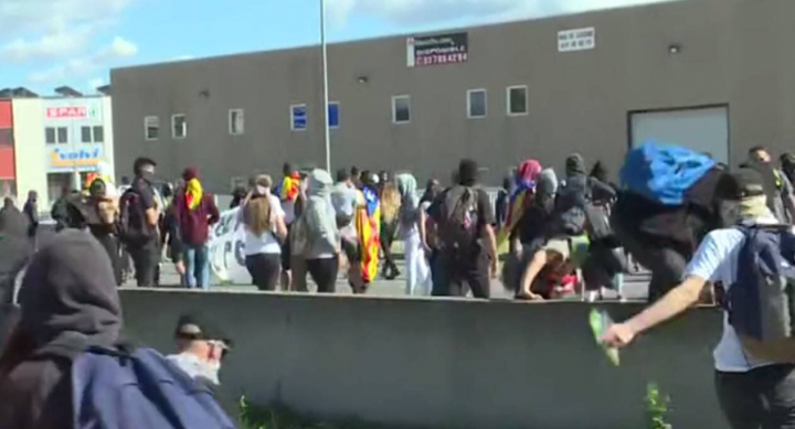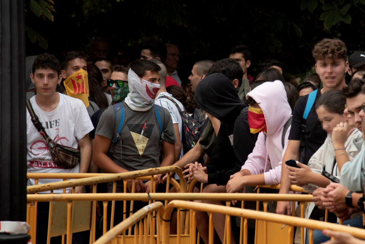 Gritos y alguna bengala entre los concentrados, muchos de ellos con la cara tapada en las primeras filas. Incluso han lanzado algún objeto a los Mossos.