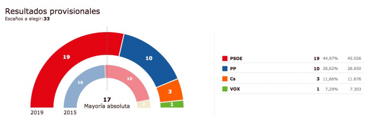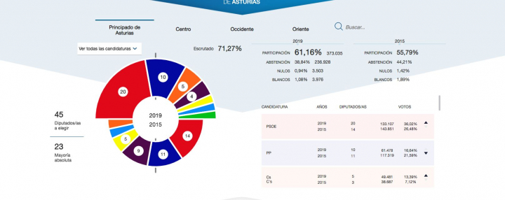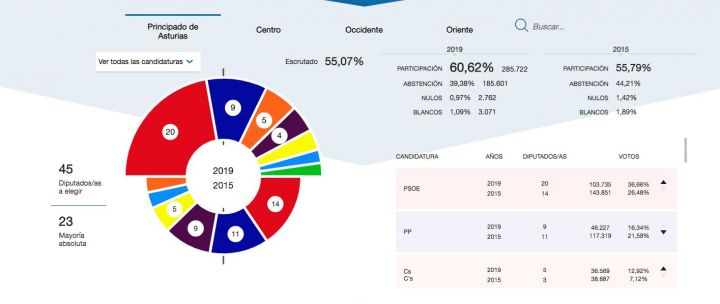 23:15 horas. El PSOE ganaría en Asturias con 20 diputados, con el 55% escrutado.