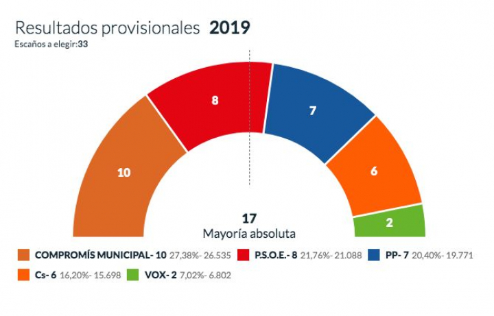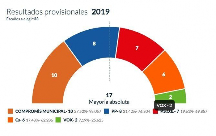 La izquierda ganaría las elecciones de este domingo en el Ayuntamiento de Valencia, donde sumaría entre 17 y 18 de los 33 concejales del hemiciclo, y Compromís aventajaría ligeramente al PSPV-PSOE, al lograr el 21′73 % de los votos y 8 concejales, frente al 20′10 % de los socialistas, que tendría entre 7 y 8 ediles.