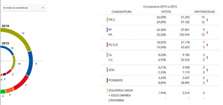 23:20 horas. Revilla se impondría en Cantabria con 14 diputados.